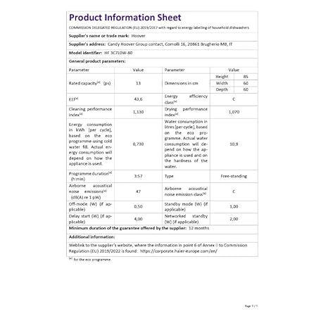 Thông tin sản phẩm Hoover H-DISH 300 Freestanding Dishwasher, 13 Place Settings, Class C, Wi-Fi & Bluetooth, Maxi Tub, Rapid Wash & Start Delay, White, 60x60x85 cm - HF 3C7L0W-80