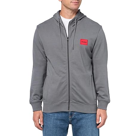 HUGO Men's Regular Fit Square Logo Jersey Hooded Zip Up Sweatshirt, Lava Smoke, S