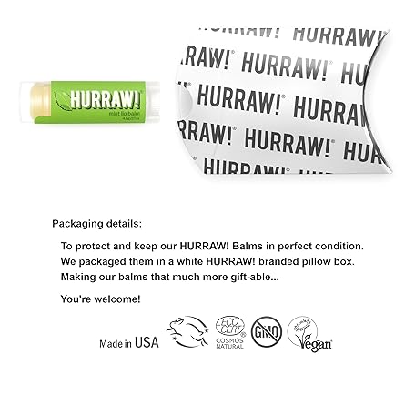 Thông tin sản phẩm HURRAW! Mint Lip Balm: Organic, Certified Vegan, Cruelty and Gluten Free. Non-GMO, 100% Natural Ingredients. Bee, Shea, Soy and Palm Free. Made in USA