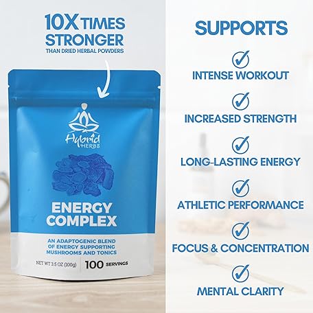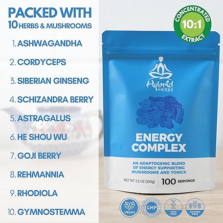 Thông tin sản phẩm HYBRID HERBS - Energy Complex | Adaptogen Blend of Ashwagandha, Cordyceps, Siberian Ginseng, Schizandra, Astragalus, He Shou Wu, Goji Berry, Rehmannia, Rhodiola, Gynostemma | 100 Servings (100g)