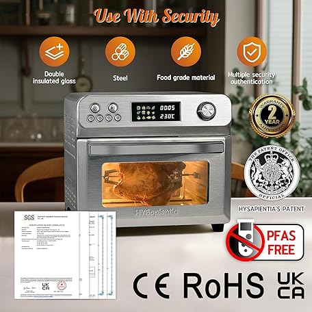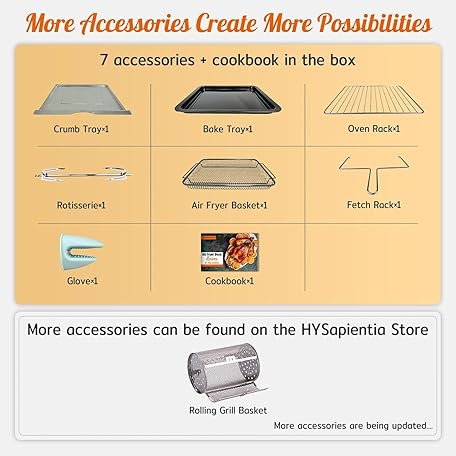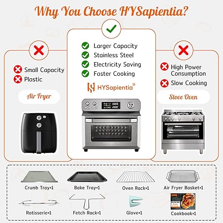 Thông tin sản phẩm HYSapientia 24L Air Fryer Oven With Rotisserie Large XXL Digital Knob 1800W 10 in 1 airfryer Countertop Convection Mini Toaster Oven electric and grill, Stainless steel inner, Full Accessory Set