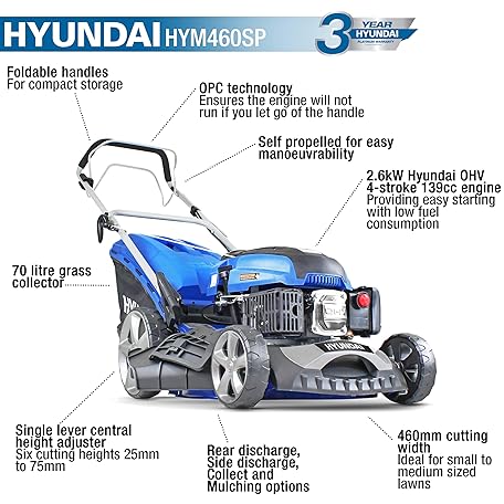 Thương hiệu Hyundai là cái tên nổi tiếng được rất nhiều khách hàng trên thế giới chọn lựa. Với kiểu dáng đẹp mắt, sang trọng, sản phẩm Hyundai 46cm Petrol Lawnmower Self-Propelled, 460mm / 18'' Cutting Width Lawn mower, 3.5HP 4-Stroke Petrol Engine, Foldable Handles, Mulching Lawn mower, 3 Year Warranty là sự lựa chọn hoàn hảo nếu bạn đang tìm mua một món cho riêng mình.
