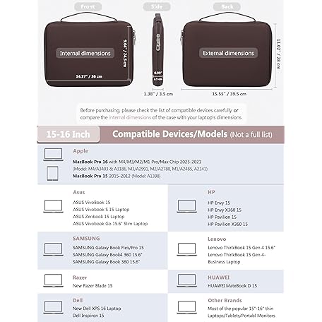Thông tin sản phẩm HYZUO 15-16 Inch Hard Shell Laptop Sleeve Case for MacBook Pro 16 M4/M3/M2/M1 2025-2019, MacBook Air 15 M3/M2/M1 2025-2023, 15" Surface Laptop, Razer Blade 15, Coffee Brown