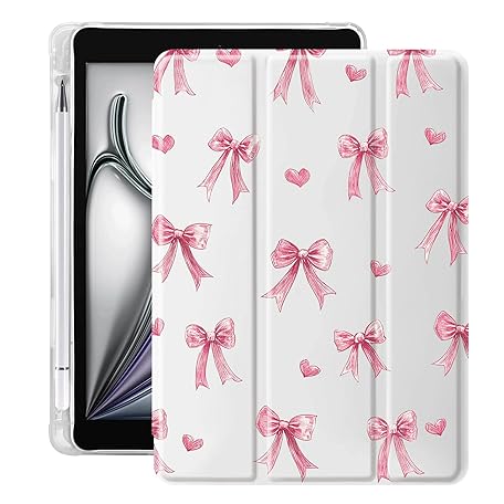 Idocolors Cute Pink Bow Pad Case for 11 Inch iPad Air(2024), Clear TPU Stand Back Cover with Pencil Holder, Auto Wake/Sleep Foldable Adjustable Shockproof Protective Case