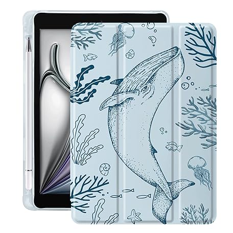Idocolors Cute Sea Whale Blue Case for 12.9 Inch iPad Pro 2022/2021/2020/2018, Clear TPU Stand Back Cover with Pencil Holder, Spring Girly Auto Wake/Sleep Foldable Shockproof Protective Case