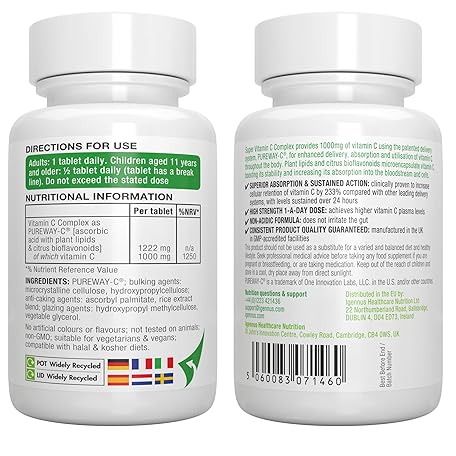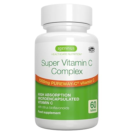 Sản phẩm Igennus Super Vitamin C Complex 1000mg, High Absorption 24-Hour Action Pureway-C, Clean Ingredients, Non-Acidic & Gentle, Vegan, 60 One-A-Day Tablets đang được bán với giá ưu đãi là $24.8847 tại nước Anh.