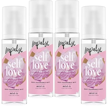 Impulse Body Mist Self Love Bundle 4 x150 ml – Rose Quartz Inspired – Long-lasting fragrance spray with rose, patchouli & cedarwood, uplifting self-care mist for daily refresh & tranquillity