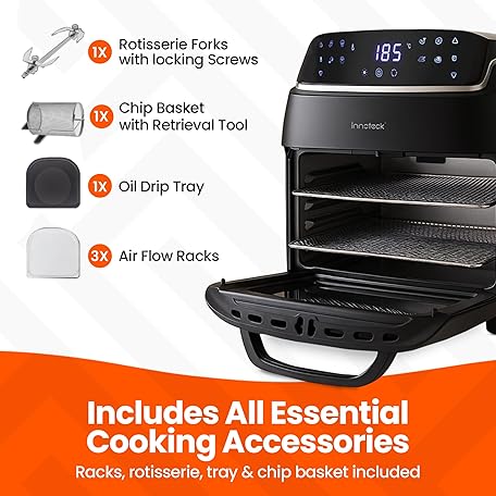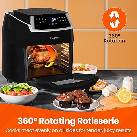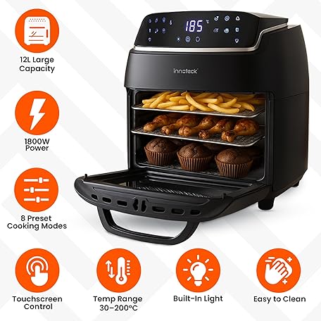 Thông tin sản phẩm Innoteck Kitchen 12L Digital Air Fryer Oven with Rotisserie 1800W Large Air Fryer with Touch Panel & 8 Cooking Presets, Shelves, Basket, Racks & Drip Tray Black & Silver Finish