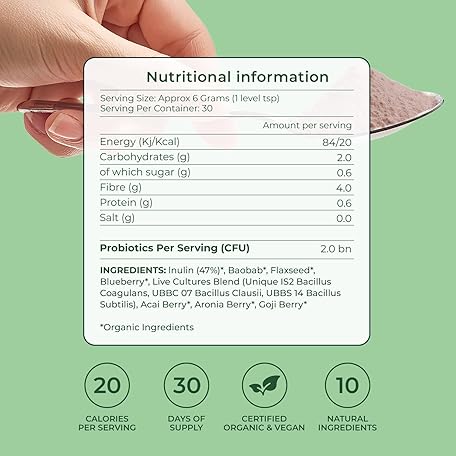 Thông tin sản phẩm Inspiriko Organic Prebiotics for Gut Health - Award-Winning 10-in-1 Gut Health Powder with Superfoods, Inulin, Probiotics and Prebiotics. No Added Sugar, Made in UK, 180 Grams