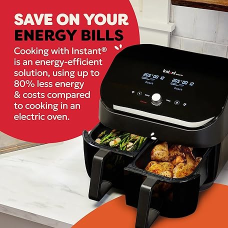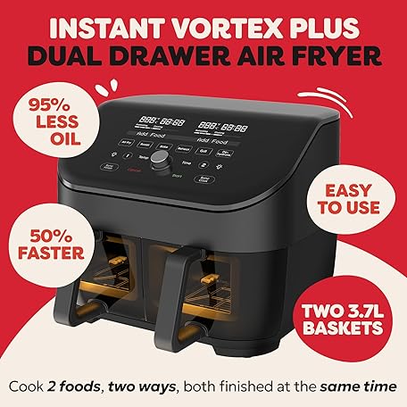 Sản phẩm Instant Pot - Vortex Plus Dual Black Air Fryer - Large 7.6L, Family Size - Twin, Double 3.7L Baskets, Clear Window, Food Dehydrator, Grill, Bake, Roast, Reheat, Non-Stick, Easy Clean, Dishwasher Safe đang được bán với giá ưu đãi là $117.0115 tại nước Anh.