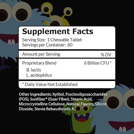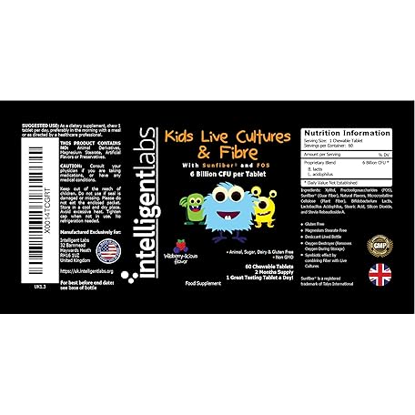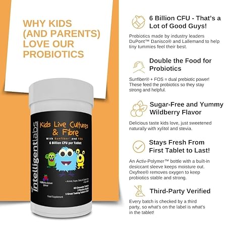 Thông tin sản phẩm Intelligent Labs 6 Billion CFU Kids/Children's Live Cultures and Fiber with Sunfiber and FOS, for 10x More Effectiveness, One A Day Great Taste Chewable Probiotic, 60-Day Supply, Third-Party Verified