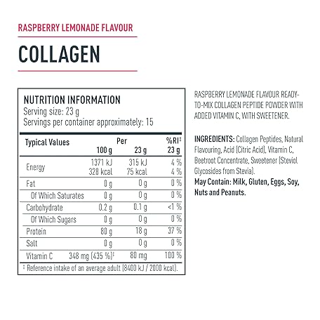 Thông tin sản phẩm Isopure Collagen Powder Raspberry Lemonade Flavour with Vitamin C for Skin & Joint Support – 20 g Collagen per Serve, Sugar-Free, No Artificial Flavours or Sweeteners – 345 g