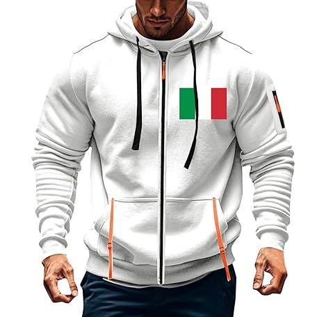 Italian Flag Hoodies for Men Full Zip Pullover Tops Sweatshirt Vintage Long Sleeve Casual Fashion Hooded with Pocket suéter Polo para Hombre(White, XXXXL)