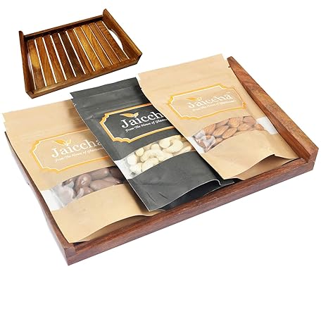 Jaiccha Ghasitaram Striped Wooden Tray of Cashews,Almonds and Chocolate Almonds |Diwali,Holi,Valentine,Christmas,Birthday,Anniversary,Gift for Her,Him,Mothers Day,Fathers Day|