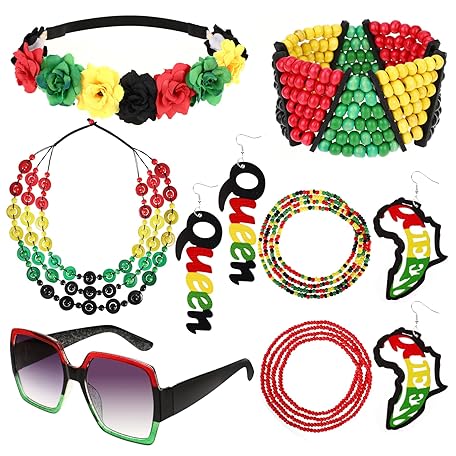 Jamaican Costumes Set, 8 Pcs Jamaican African Costumes for Women Include Rasta Beaded Bracelet Wood Dangle African Earrings Necklace Rasta Sunglasses Flower Crown Headband Waist Bead Chain
