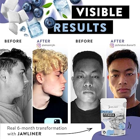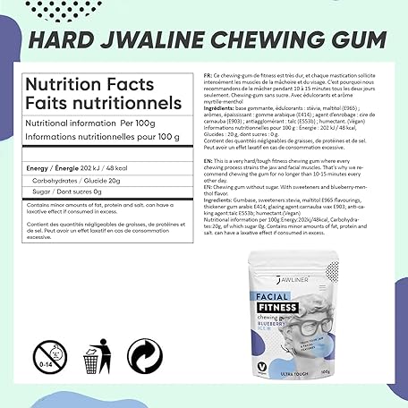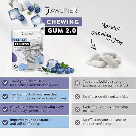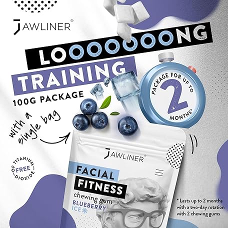 Thông tin sản phẩm JAWLINER® Jawline Gum - Hard Chewing Gum for Jawline Exercise - 2-Month Pack - Jaw Gum for a Chiseled Jawline, Facial Fitness Chewing Gum, 10 X Stronger Gum (1 count (Pack of 1), Blueberry Ice)