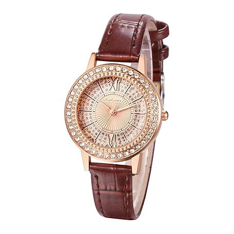 JewelryWe Women's Rhinestone Leather Watch: Analog Round Quartz Casual Wristwatch Stylish Bracelet Watches for Ladies