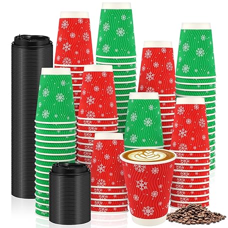 Jingmore 48 Pcs 12 Oz Christmas Coffee Cups with Lids Snowflake Winter Disposable Paper Insulated Ripple Togo Cups for Hot Chocolate Coffee Water Tea Xmas Holiday Supplies (Red,green)