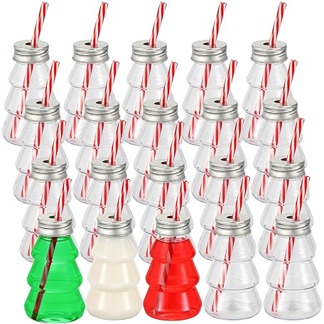 Jingmore Baderke 20 Set Christmas Plastic Tree Bottles with Straws Set Including Tree Drink Empty Bottles & Straws and Caps for Christmas Party Juice Milk Cup Drink Water Containers