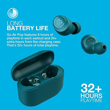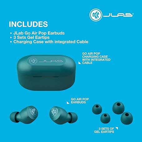 Thông tin sản phẩm JLab Go Air Pop True Wireless Earbuds, In Ear Headphones, Bluetooth Earphones, Ear Buds with 32H Playtime, Bluetooth Earbuds with Microphone, USB Charging Case, Dual Connect, EQ3 Sound, Teal