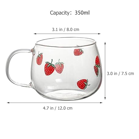 jojofuny Strawberry Print Glass Cup 350ml Multi-use Coffee and Milk Tea Mug Heat-Resistant Glass Water Cup for Household Cold and Hot Drinks