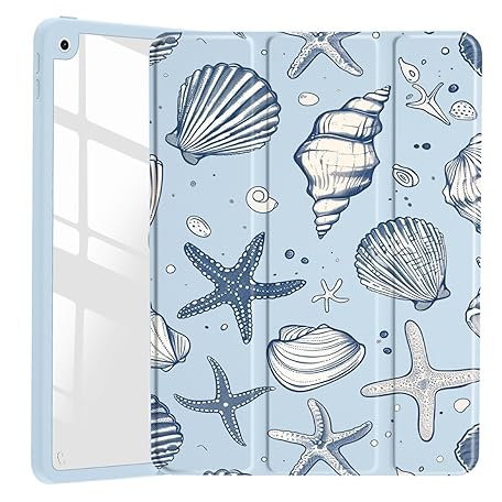 JOYLAND Sea Shells Case for iPad Air 11 Inch M3(2025) / M2(2024), iPad Air 5th(2022) / 4th (2020) Gen 10.9 Inch, Clear Acrylic Hard Back Ice Blue Case with Pencil Holder Trifold Stand Tablet Cover