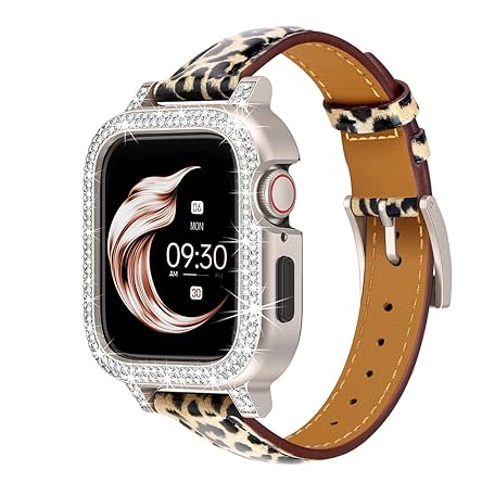 Juntan Premium Leather Watch Band Compatible for Apple Watch 40mm 41mm 44mm 45mm Bands, Leopard Print Replacement Bracelet with Bring Protective Frame Bumper Case for iWatch Strap Series 8 7 6 5 4 SE