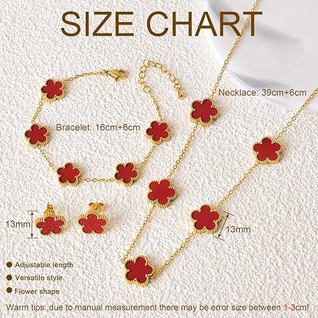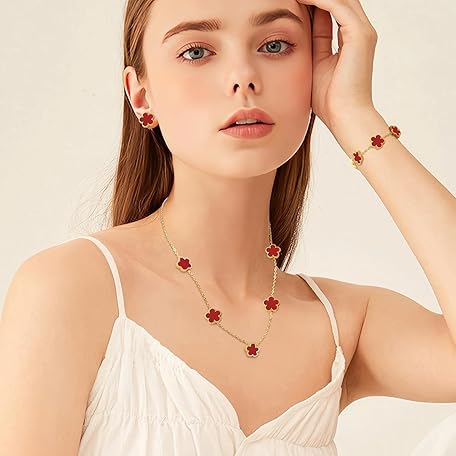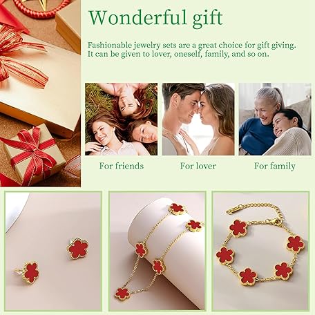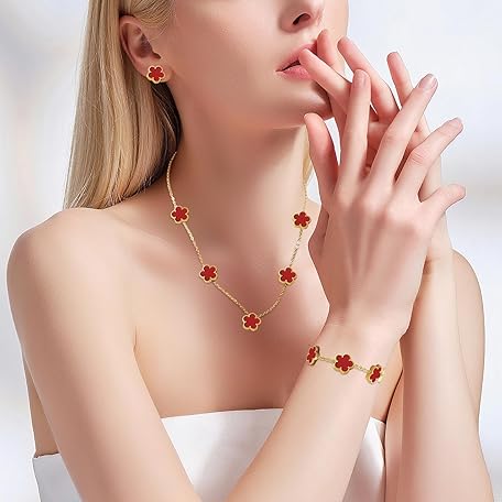 • JYIXXZX Four-Leaf Clover Jewellery Set for Women 18K Gold Plated Stainless Steel Double-sided Lucky Clover Pendant Necklace Stud Earrings Bracelet Adjustable Jewelry Birthday Valentine’s Gift