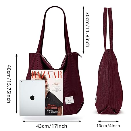 KALIDI Women Corduroy Tote Bag Zipper Casual Tote's Handbag Big Capacity Shoulder Bag with Pockets, Red, L