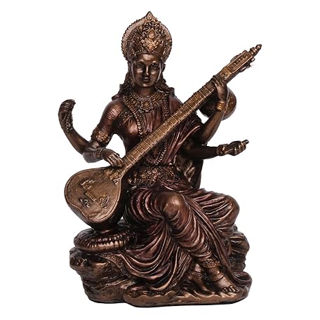Kartique Divine Resin Saraswati Statue, Traditional Veena Goddess Figurine, 6 Inch, Bronze Finish