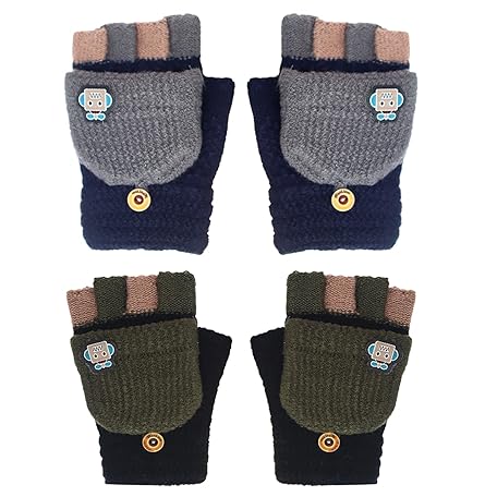 KASESSS 2 Pairs Warm Kids Gloves Flip-Top Convertible Fingerless Gloves Kids 6-12 Years Old Boys Soft Winter Knitted Mittens with Cute Cartoon Robot Design for Children, Navy Blue Grey