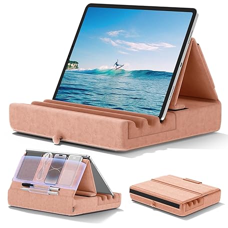 KDD Tablet Pillow Holder, Foldable iPad Stand for Lap, Bed and Desk -Tablet Soft Pad Dock with Pocket & Stylus Mount Compatible with iPad Pro 12.9, 10.5 Air Mini 6 5 4 3, Kindle, E-Reader, Peach Fuzz