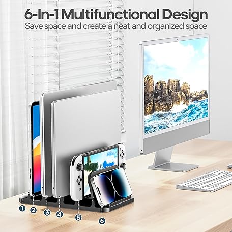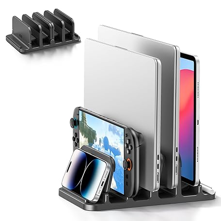 KDD Vertical Laptop Stand with 4 Slot,6-in-1 Laptop Holder Desktop Stand with Gravity Locking,Space-Saving Organizer for MacBook/Microsoft Surface/Samsung/HP/Dell/Book/Tablet/Switch/Cell Phone