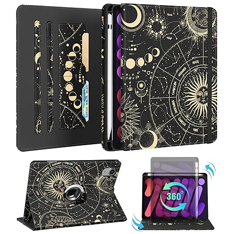 Kidcube for iPad mini 7 Case A17 Pro 2024, for iPad mini 6th Generation Case 8.3 Inch - Women Girls Cute Rotating Stand Folio Cover with Pencil Holder & Card Slot Girly Sun Moon Stars Teens Cover