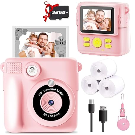 Kids Camera Instant Print - 1080P HD Video & Instant Camera for Kids with 32GB Card & 3 Rolls Paper, Selfie Digital Camara - Christmas Birthday Funny Toys Gifts for 3-12 Years Old Girls & Boys-Pink