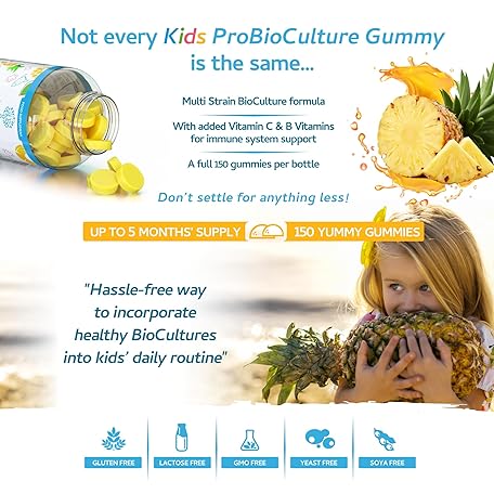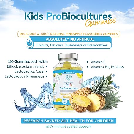 Sản phẩm Kids Probiotics/ProBiocultures Gummies - 150 Children's probiotics Multi-Strain Gummies - Natural Pineapple Flavour – with Added B & C Vitamins for Immune Support - 5 Month Supply – UK Made đang được bán với giá ưu đãi là $25.7894 tại nước Anh.