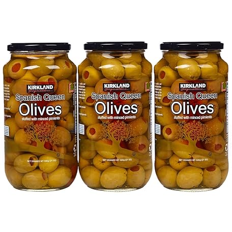 Kirkland Signature Spanish Queen Olives Stuffed With Minced Pimiento, 21oz Glass Jar (Pack of 3, Total of 63 Oz)
