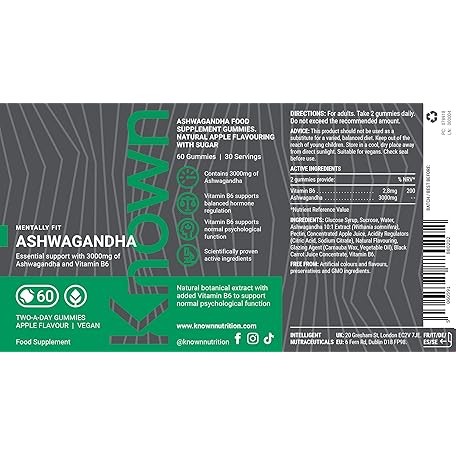 Thông tin sản phẩm Known 3000mg High Strength Ashwagandha Gummies – Apple Flavour – Chewable Vegan Gummy Supplement – Energy, Mood & Wellbeing Support – 1 Month Supply – Root Extract with Vitamin B6 – for Men & Women