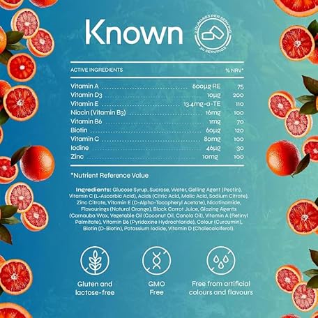 Thông tin sản phẩm Known Daily Multivitamin Gummies – Blood Orange Flavour – Vegan Gummy Supplement – Vitamin A, C, D, E, B6, Biotin, Zinc, Iodine – Immune Health, Energy, Wellbeing – 1 Month Supply – for Men & Women