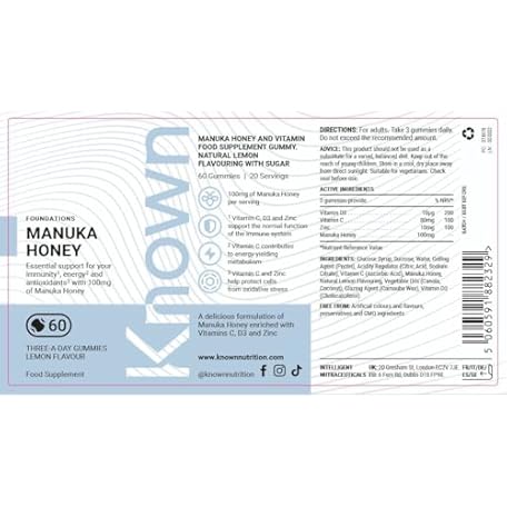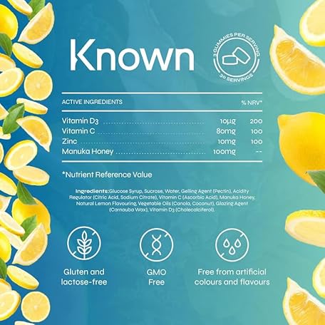 Thông tin sản phẩm Known Manuka Honey Gummies – Lemon Flavour – 100mg Manuka Honey with Vitamin C, D3 & Zinc – Chewable Gummy Supplement – Natural Immune & Wellness Support – 1 Month Supply – for Men & Women