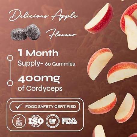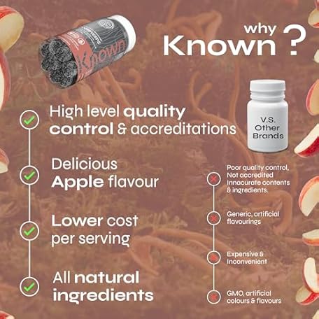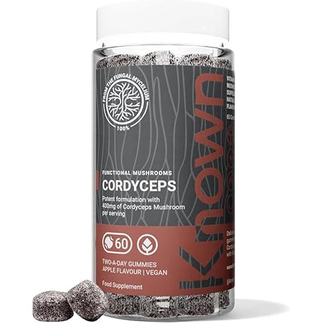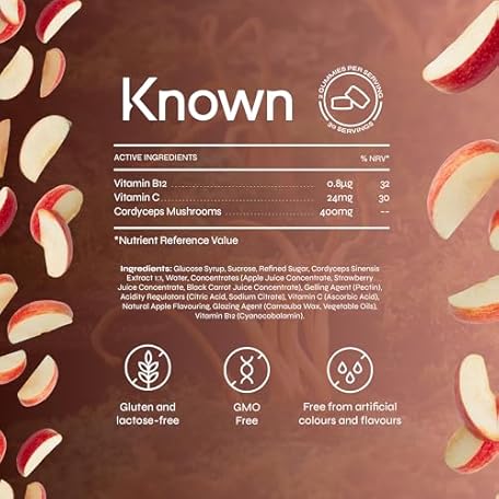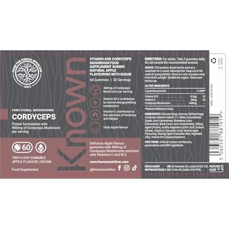 Thông tin sản phẩm Known Tasty Cordyceps Gummies - 400mg Cordyceps Mushroom - Vitamin B12, C - Energy Support - Natural Apple Flavour - 60 Vegan Gummies, 1 Month Supply