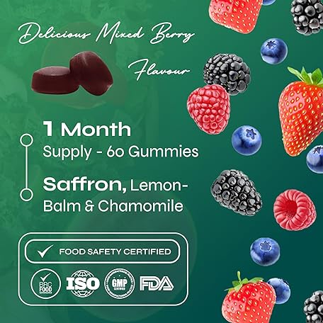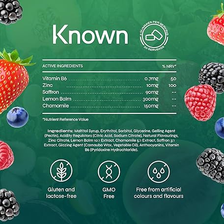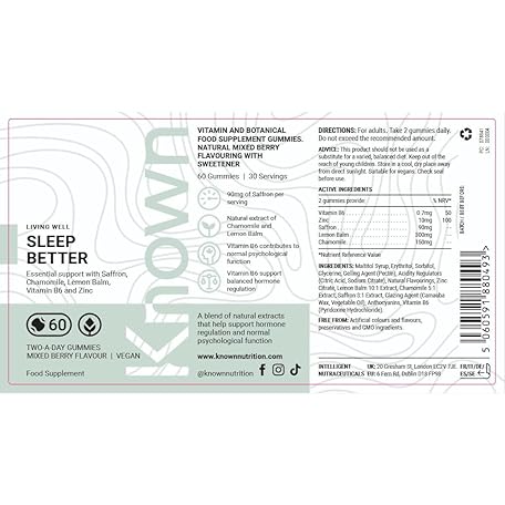 Thông tin sản phẩm Known Tasty Sleep Better Gummies - Sugar-Free - Saffron, Lemon Balm, Chamomile & B6 - Natural Mixed Berry Flavour - 60 Vegan Gummies, 1 Month Supply