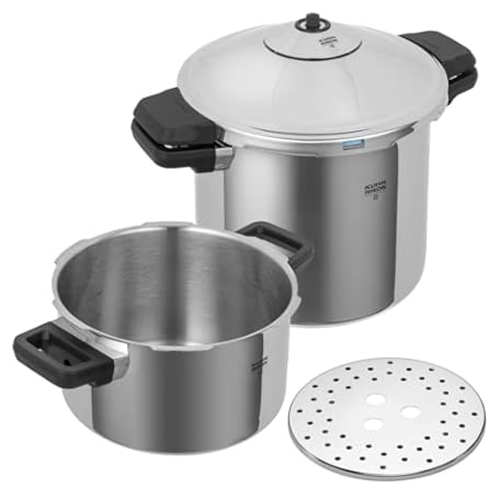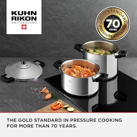 Thông tin sản phẩm Kuhn Rikon Pressure Cooker Set, 4L and 8L (24cm) Duromatic Inox Food Steamers with Side Grips. Multi Cooker Hotpot with Auto Lock Lid. Stainless Steel Pot – 10 Year Kuhn Rikon Cookware Guarantee
