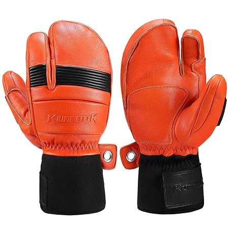 KUTOOK Ski Mittens Men Women with HIPORA Waterproof Membrane Goat Leather Gloves for Skiing Outdoor Orange