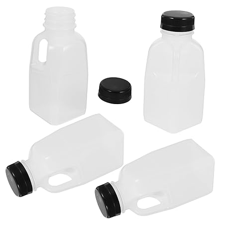 LALADEFIEE Reusable Milk Bottle Set Black Caps 4pcs Plastic Juice and Beverage Containers Leakproof Drink Storage Bottles for Commercial and Home Use