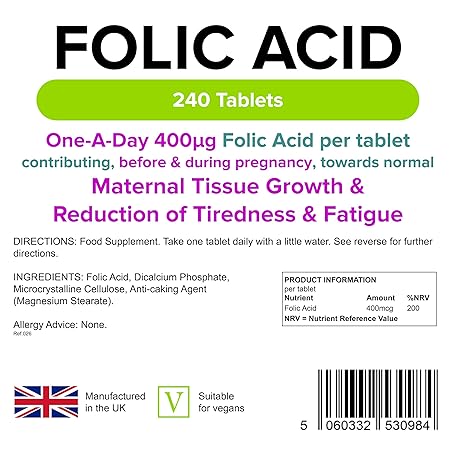 Thông tin sản phẩm Lindens - Folic Acid 400mcg - 240 Vegan Tablets - UK Made to GMP - Pregnancy, Immune Health, Energy and Vitality, Blood Formation, Psychological Function, Amino Acid - Letterbox Friendly