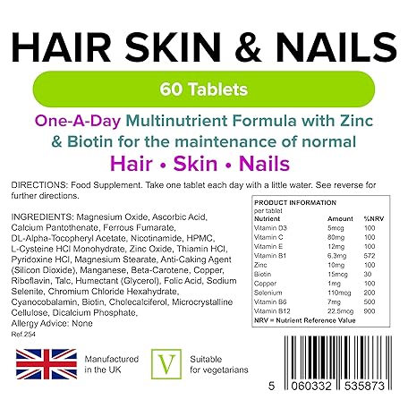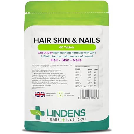 Thông tin sản phẩm Lindens - Hair Skin & Nails, 60 Tablets - 1 a Day, UK Made - Healthy Hair, Skin & Nails - Multinutrient Formula with Zinc, Biotin, Vitamin C, Vitamin E - Letterbox Friendly