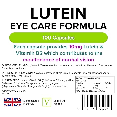 Thông tin sản phẩm Lindens - Lutein 10mg, 100 Capsules - UK Made - Marigold Extract with Vitamin B2 - Vision & Eye Health, Standardised Potent Extract - Letterbox Friendly - Vegan
