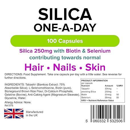 Thông tin sản phẩm Lindens - Silica 250mg, 100 Capsules - UK Made - Fortified with Biotin & Selenium, Contributes to Healthy Hair, Nails & Skin - Premium Bamboo Extract, Letterbox Friendly