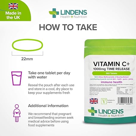 Thông tin sản phẩm Lindens - Vitamin C+ 1000mg Time Release, 360 Tablets - 1 a Day, UK Made - Skin, Teeth, Joints and Immune Health, Combats Tiredness and Fatigue - Vegan